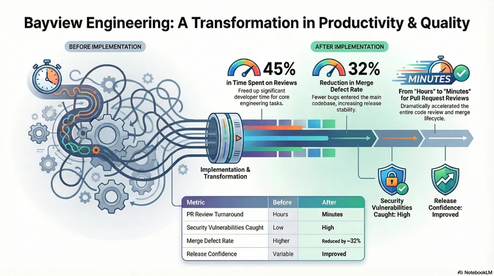 As Bayview’s software engineering needs grew, their manual code review process became a constraint. Managing multiple internal tools and client integrations meant that senior engineers were spending disproportionate time reviewing code rather than building features.